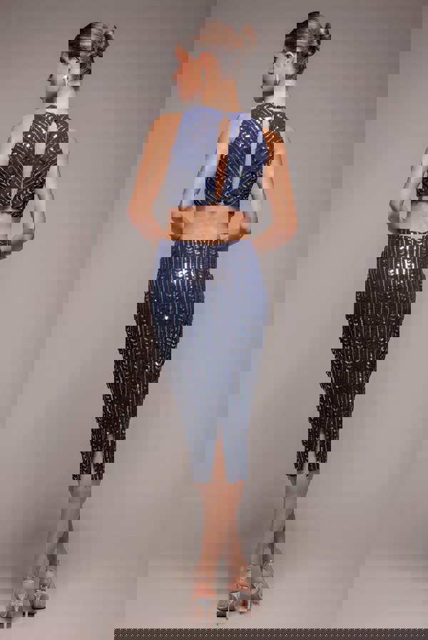 Whether you're attending a cocktail party, a formal event, or a night out on the town, the Patterned Sequin Cut Out Midi Dress in Navy from Goddiva is sure to make a statement.