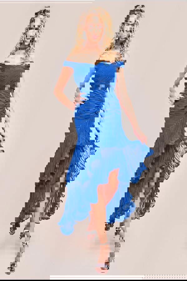 Indulge in the epitome of sophisticated charm with our Pleated Bardot High Low Tier Chiffon Midaxi Dress, a testament to timeless elegance and effortless style.