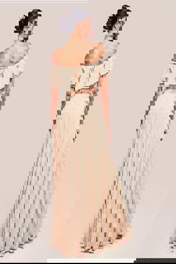 This stunning beige Pleated Chiffon Off Shoulder Maxi is the perfect choice for any special occasion, especially for bridesmaids.