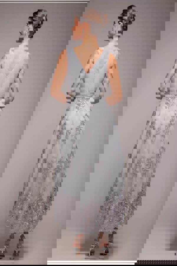 Elevate your presence at weddings, semi-formal occasions, and gatherings with this grey dress that seamlessly combines sophistication and modern flair.