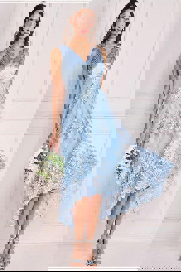 Perfect for a wedding guest outfit, prom dress or any other semi-formal event, this light blue midi dress features a flattering V-neckline and pleated detailing that adds an extra touch of sophistication.