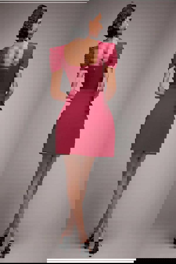 Featuring a daring plunging V neckline and a flattering square neck back, this skater style mini dress exudes feminine allure for nights out and special occasions.