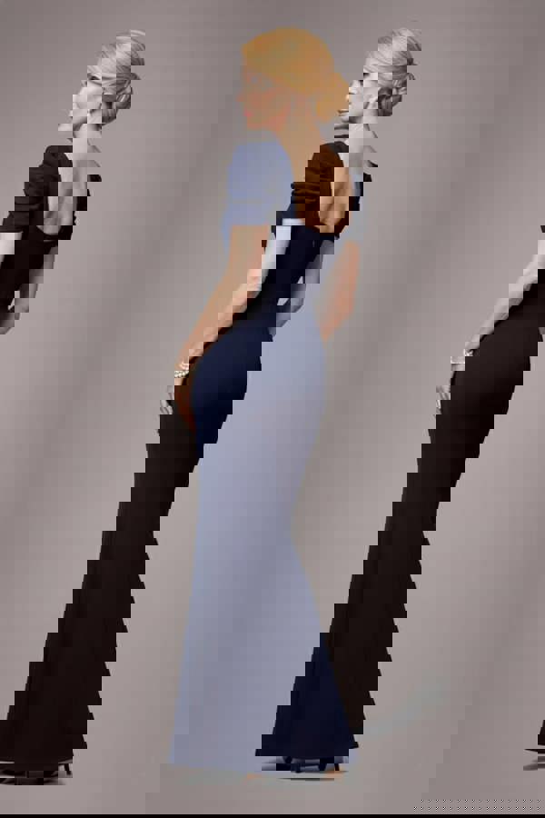 The deep navy hue and luxurious scuba crepe fabric create a rich, high-end finish that feels runway-ready yet effortlessly wearable.