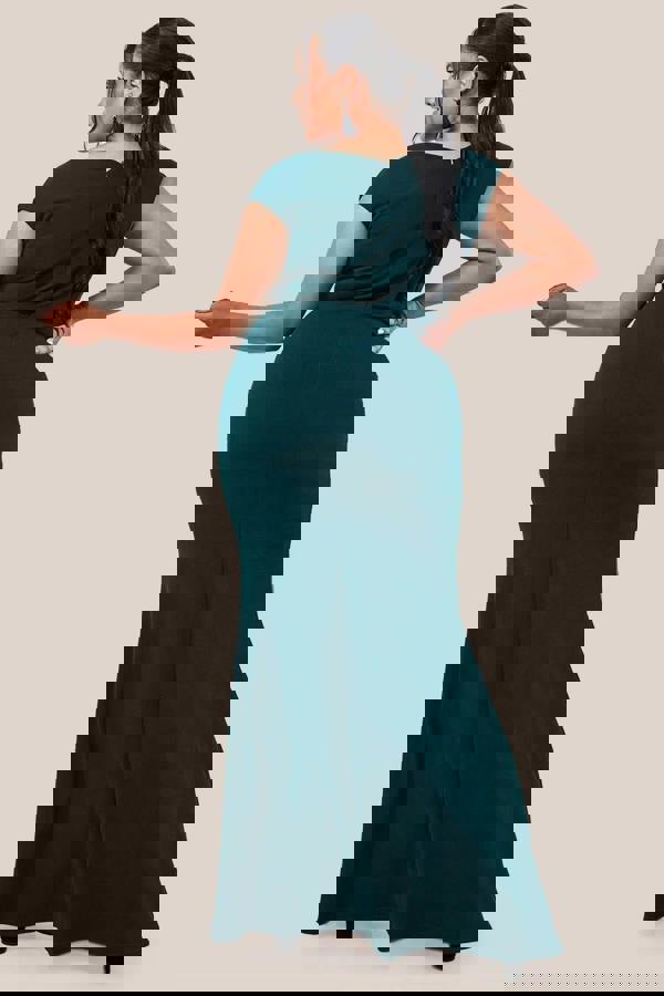 Its bold emerald green/navy colour and classic long length, not to mention its flattering pleating detail, this occasion dress is one that will suit all.