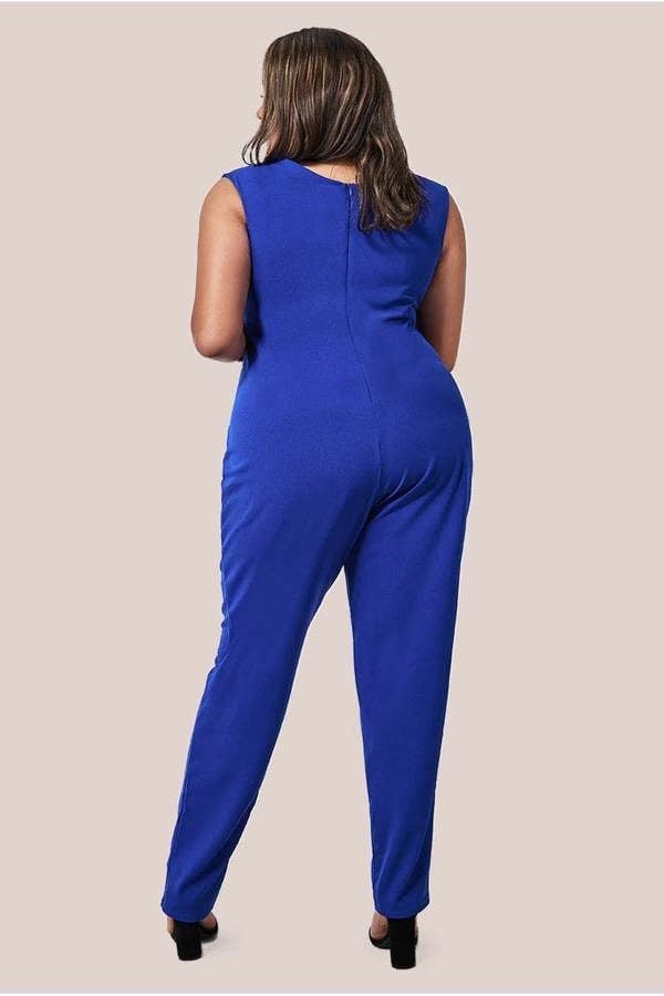 With its off the shoulder style, plunging neckline and bold blue colour, you will stand out at any event in this stunning scuba crepe fuller figure all in one.