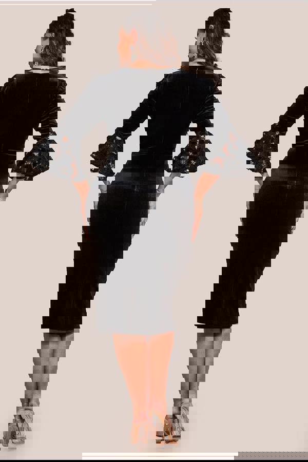 The three-quarter sleeves feature exquisite crochet velvet lace frill detailing, enhancing the dress’s refined silhouette.