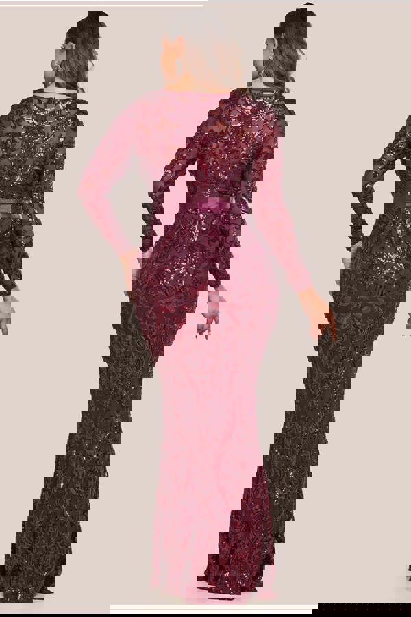 Add a touch of glamour to your evening occasions with this stunning burgundy embroidered sequin and mesh maxi dress from the Goddiva Plus Size Collection.