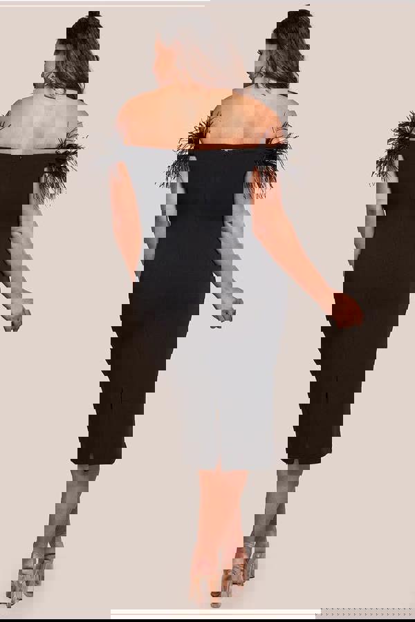 Elegant and chic, the Goddiva plus off-the-shoulder feather midi dress exudes a romantic and feminine vibe.