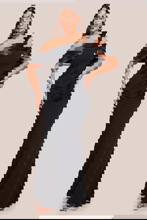 The one-shoulder satin band detail brings an ultra-chic touch, while the seductive off-the-shoulder neckline and floor-length silhouette create an unforgettable look.