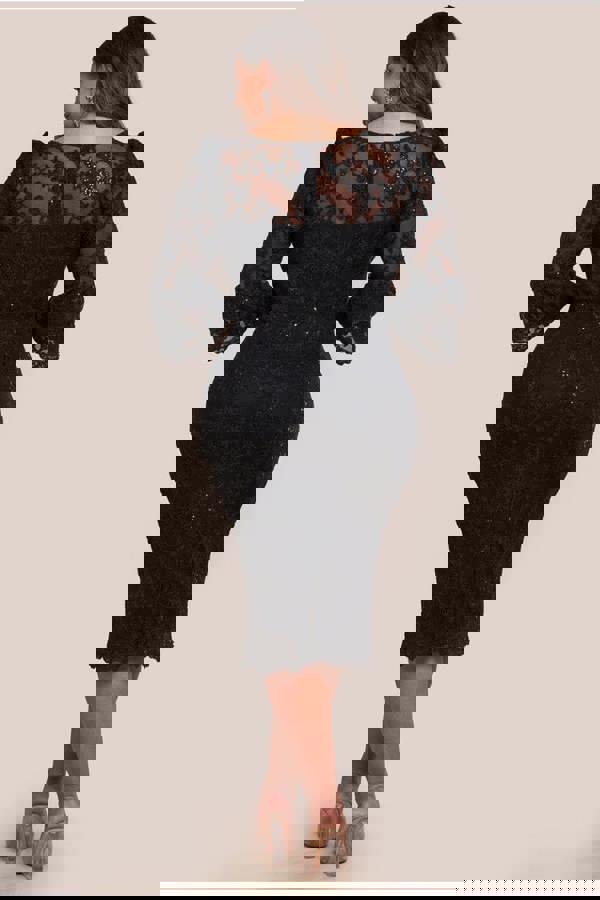 The flattering V-neckline and sheer lace sleeves enhance the bodycon silhouette, accentuating your curves with effortless elegance.