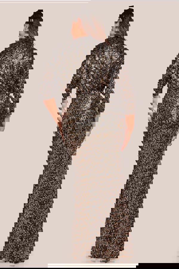 The star of this black dress is the mesmerising sequin fabric that catches the light with every step you take, creating a captivating effect as you move.