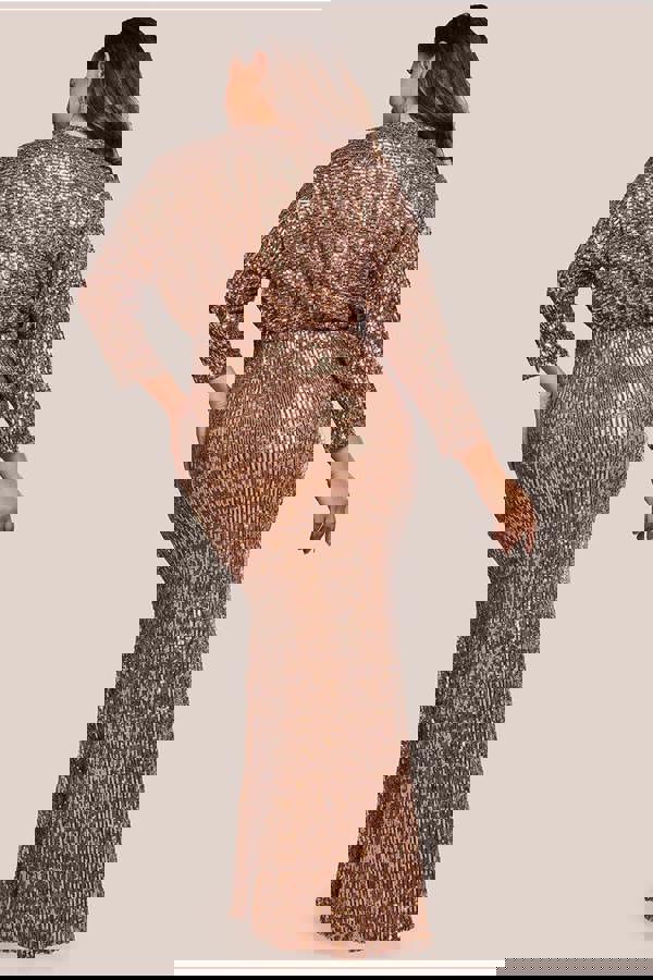 The star of this bronze dress is the mesmerising sequin fabric that catches the light with every step you take, creating a captivating effect as you move.
