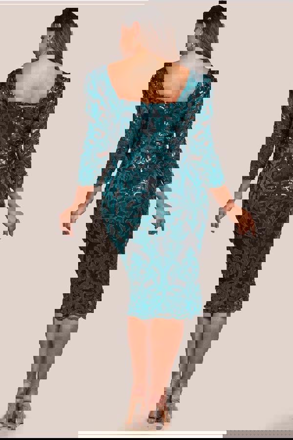 The flattering square neckline and fitted silhouette embrace your curves, while the intricate scalloped lace, embellished with shimmering embroidered sequins, adds a touch of opulence.