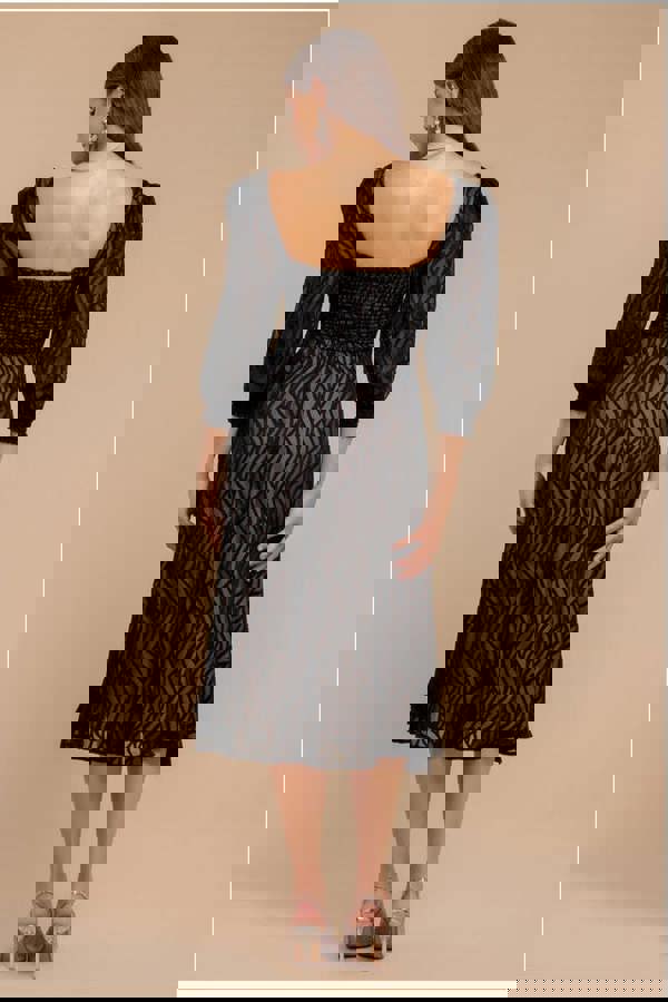 This enchanting piece features a flattering square neckline that frames the décolletage beautifully, while the three-quarter sleeves with gently puffed shoulders add a touch of romantic allure.