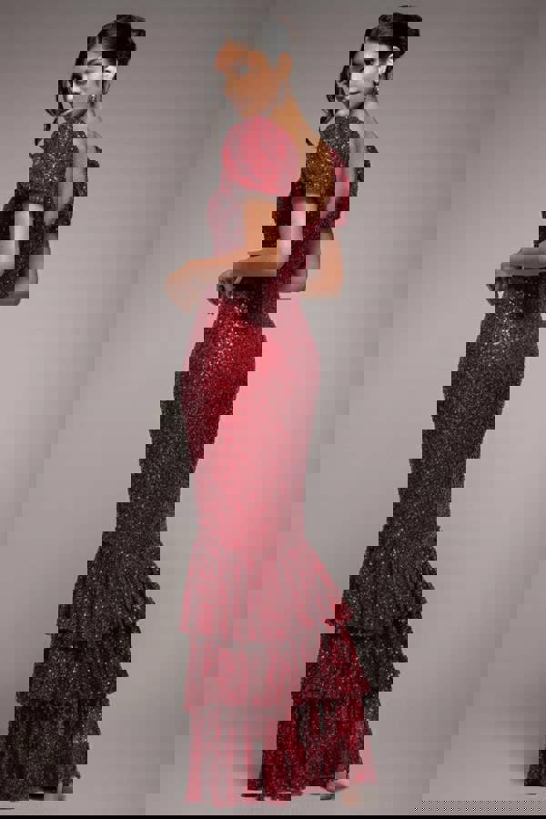 The Goddiva Puff Sleeve Tiered Hem Maxi Dress, a breathtaking blend of elegance and style, perfectly suited for those special evening occasions that demand a touch of sequin sparkle.