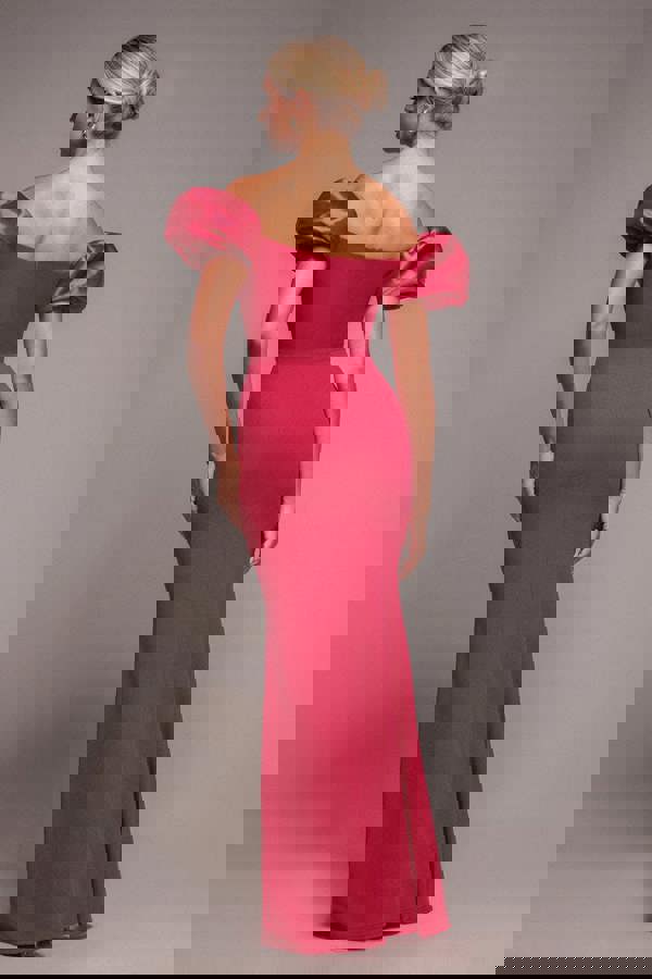 Magenta is having a major moment — and this Goddiva Puffy Satin Sleeve Scuba Maxi Dress captures the trend with unapologetic glamour.