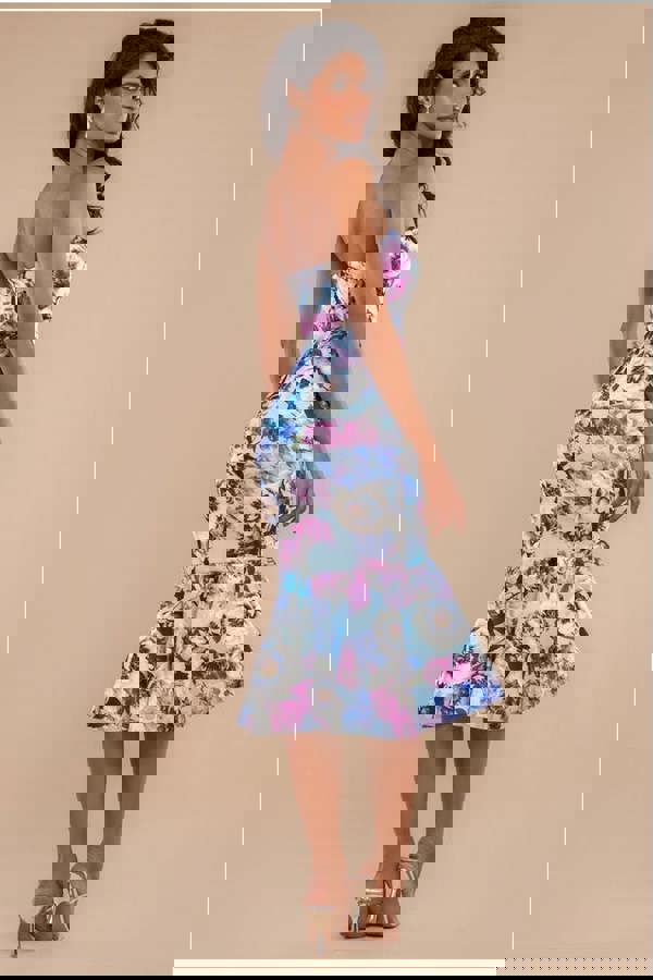 The Goddiva Ruffled Floral Scuba Foam Bandeau Midi Dress in light blue is a stunning addition to any wardrobe.