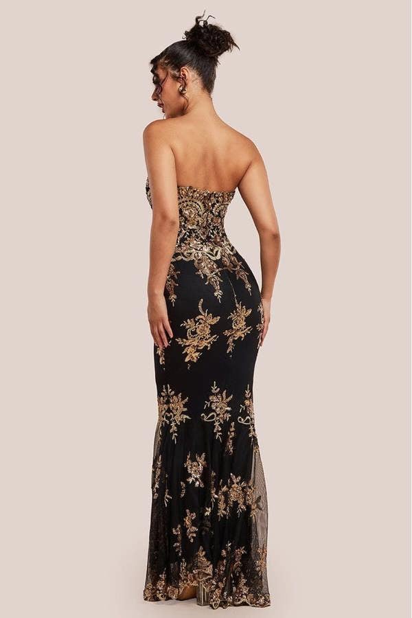 Slip into the ultimate showstopper with the Goddiva Scallop Bandeau Sequin Mesh Maxi Dress in Black Gold.