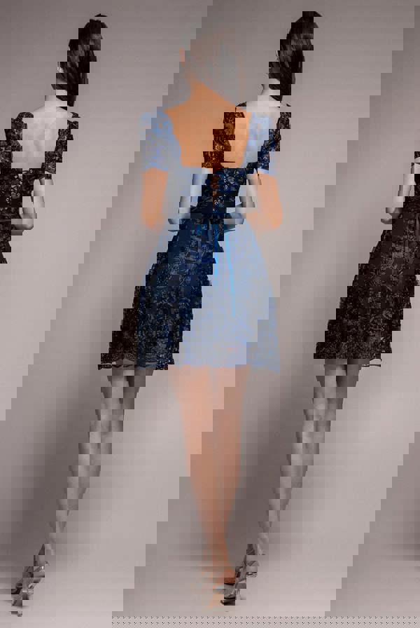Featuring a square neckline with a delicate scalloped edge and short sheer embroidered lace puff sleeves, this dress exudes feminine allure.