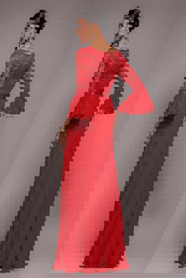 The three-quarter bell sleeves add a dramatic touch, while the satin waistband cinches the waist, enhancing the flow of the pleated chiffon A-line skirt.
