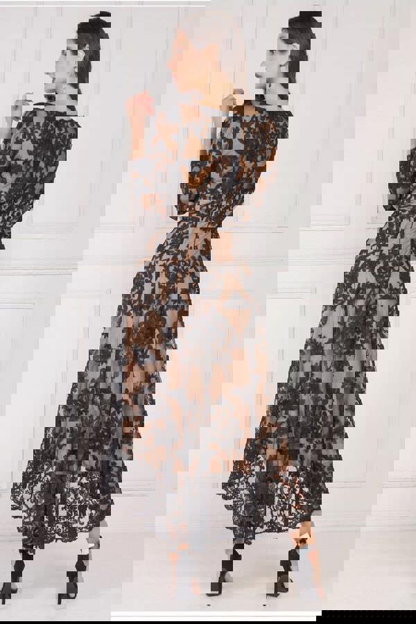 This romantic black midi dress has a v-neckline, sheer sleeves and back, scalloped detail on the neckline, long sleeves and dipped hem.