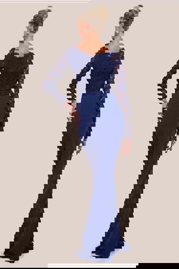 Whether you're dressing for bridesmaid duties, prom, or a formal event, this classic navy gown is an ideal choice, blending intricate lacework with a sleek, contemporary finish.