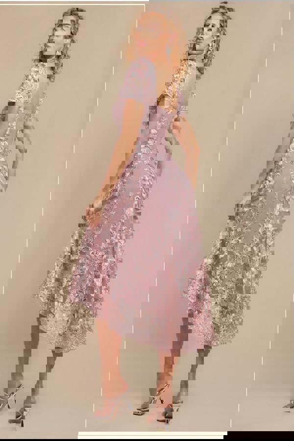 A timeless blend of elegance and charm, the Goddiva Scalloped Neck Embroidered Lace High Low Midi Dress in Pink is a must-have for spring and summer occasions.