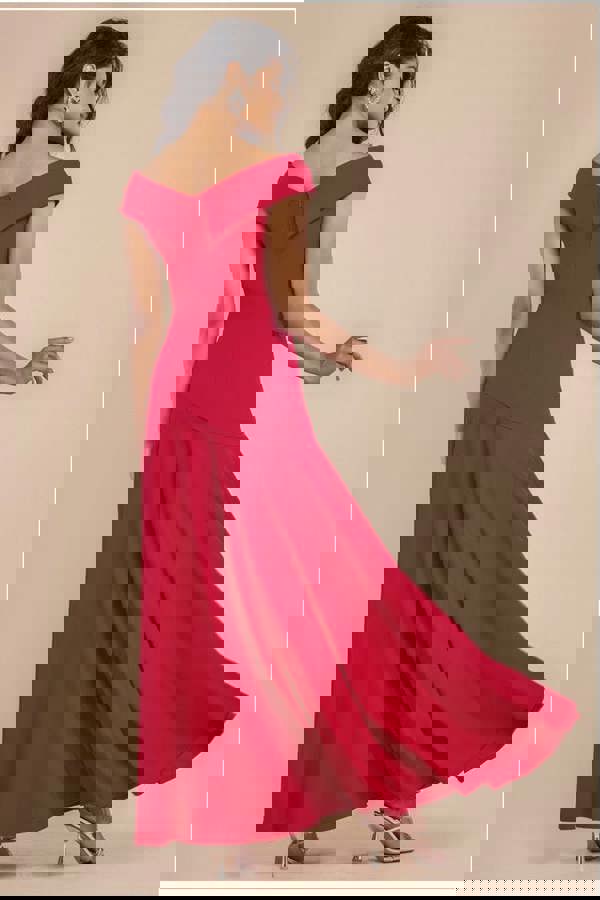 The Goddiva Scuba Crepe Off Shoulder Front Split Maxi Dress in rich ruby red is a bold, romantic choice for weddings, black-tie events, and glamorous evenings out.