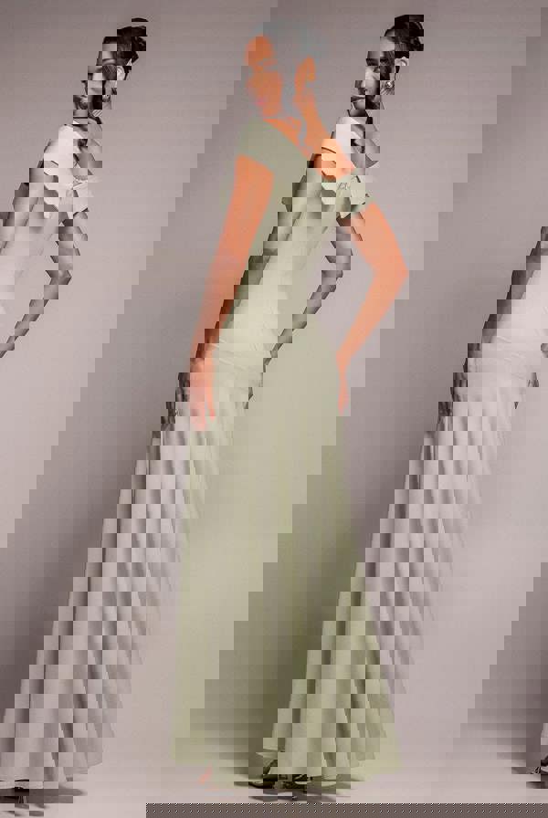 Sage green perfection with a touch of romance – this off-shoulder maxi dress in luxurious scuba crepe is the epitome of sophistication.