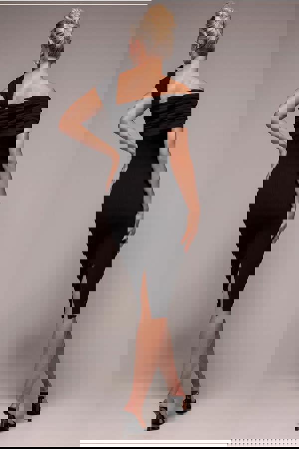 This sophisticated dress combines a sleek bodycon fit with a chic one-shoulder style, featuring a uniquely dropped shoulder on the opposite side for a contemporary twist.