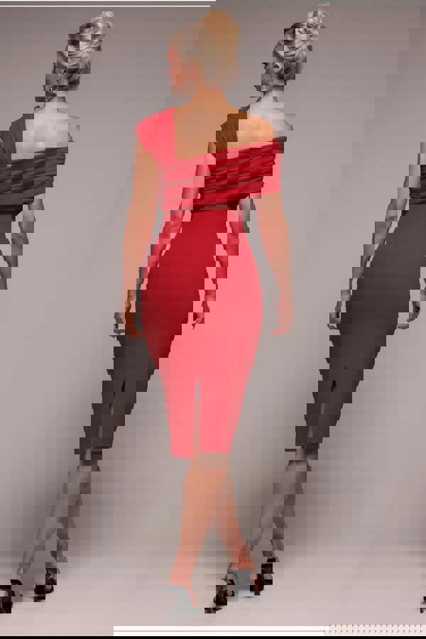 This sophisticated dress combines a sleek bodycon fit with a chic one-shoulder style, featuring a uniquely dropped shoulder on the opposite side for a contemporary twist.