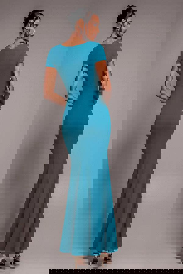 This teal Scuba Crepe Twist Cutout Maxi Dress is your ultimate choice for an unforgettable evening look.
