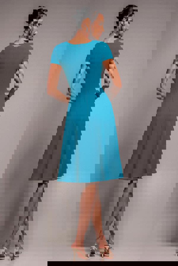 Crafted from luxurious scuba crepe fabric, this teal dress boasts a figure-flattering skater silhouette that hits just above the knee, offering both comfort and style.