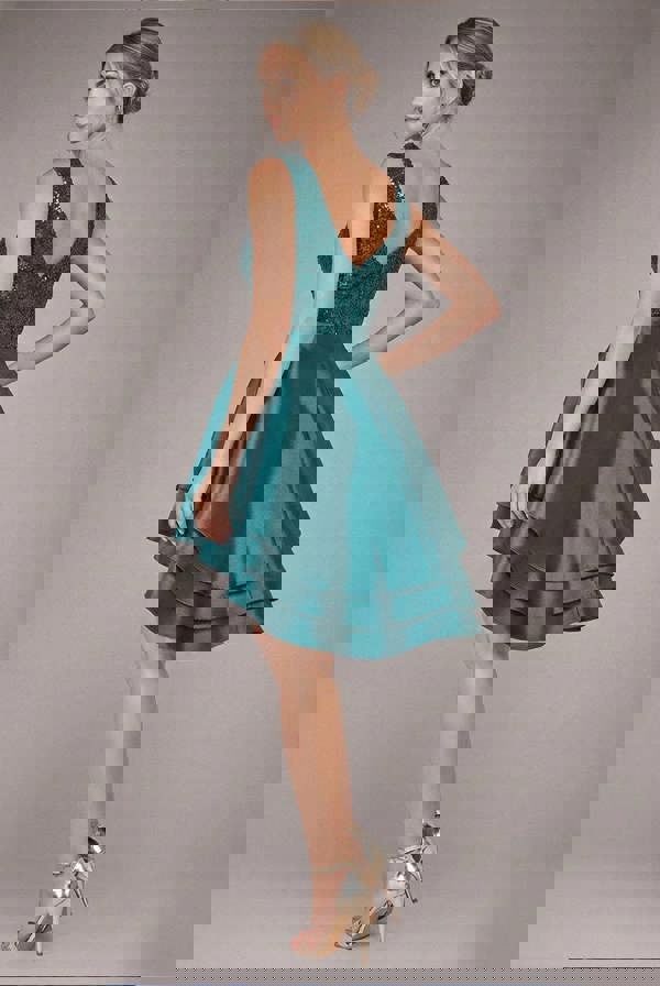 Featuring a plunging V Neckline and sleeveless design, the sequin bodice adds a dazzling touch of glamour, while the satin tiered skirt creates a chic and feminine A Line silhouette.