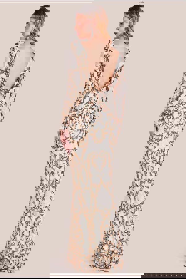Crafted to perfection, the Sequin Cowl Back Maxi Dress boasts a breathtaking display of embroidered sequin detailing that adorns the entire gown.