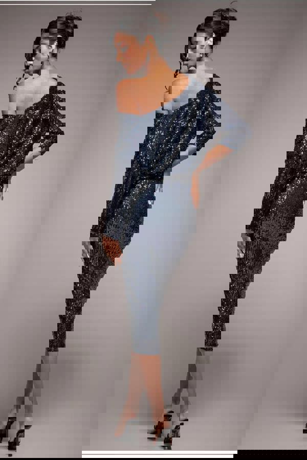 Midi length, cowl neck, off the shoulder, one shoulder, three-quarter sleeves, bodycon skirt, loose fit top, sequin, elasticated waistband, fully lined, pull on style, hanger loops. Fabric Composition - Linea Sequins- 93% Polyester, 7% Elastane, Lining- 100% Polyester Centre back to hem is approx 110cm based on a UK 8.
