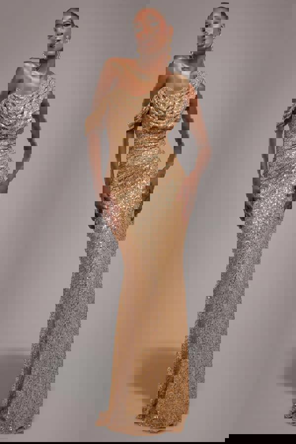Embrace the enchantment of evening events and special occasions with our gold Sequin Cowl One Shoulder Maxi Dress.