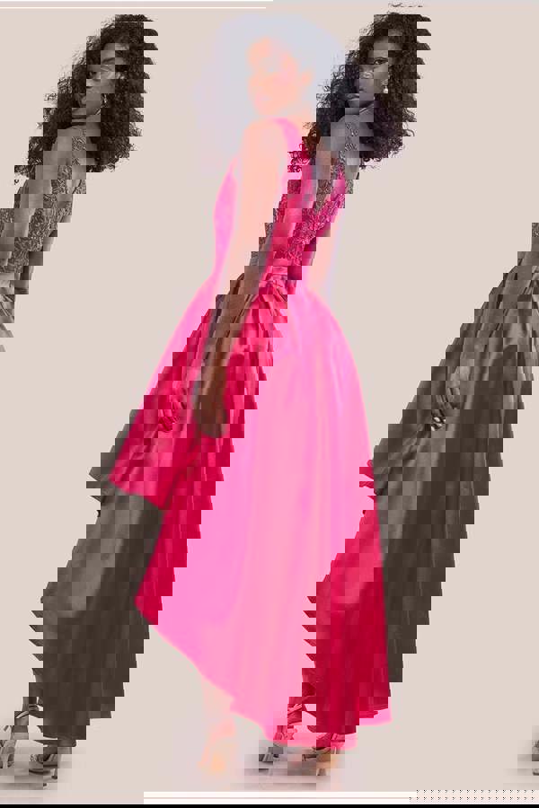 This stunning hot pink midi occasion dress combines the glamour of sequins with the luxurious feel of satin for a truly show-stopping look.