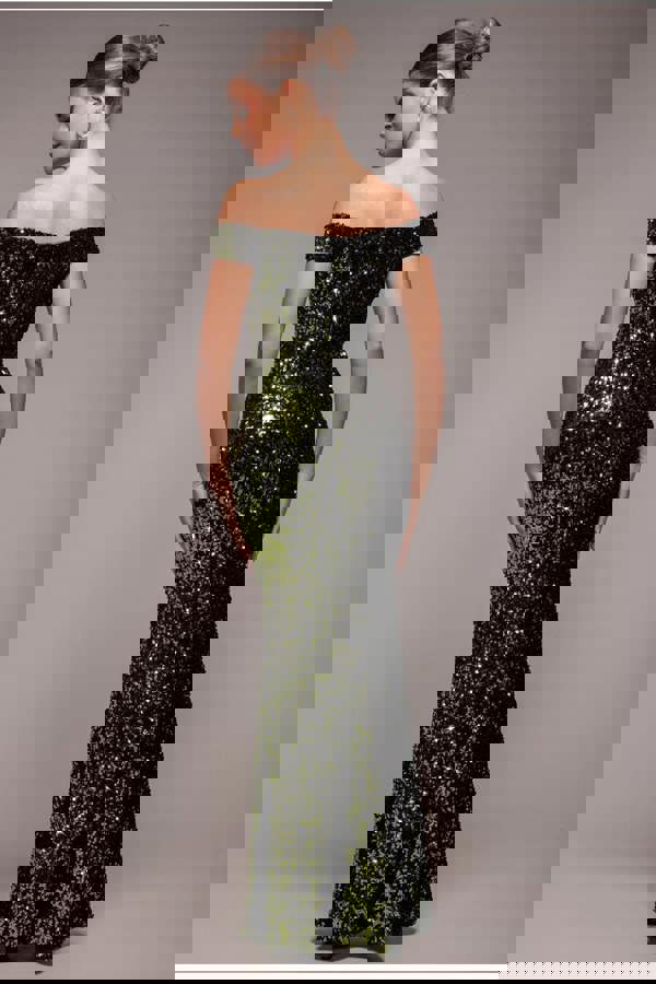 Slip into pure elegance with the Goddiva Sequin Velvet Bardot Evening Maxi Dress in Olive Green.