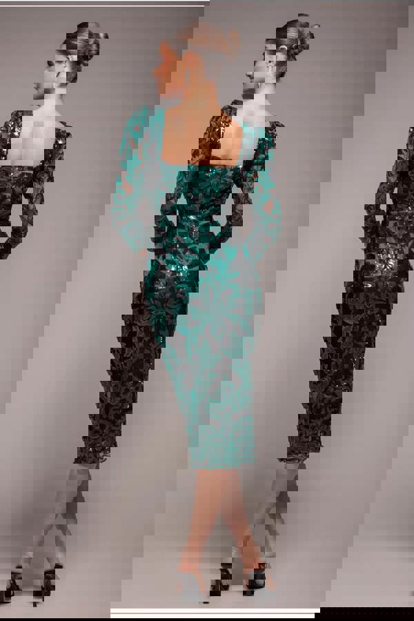 The enchanting emerald green hue is a bold, sophisticated choice, ideal for making an unforgettable entrance at cocktail parties, weddings, or any after-dark event.