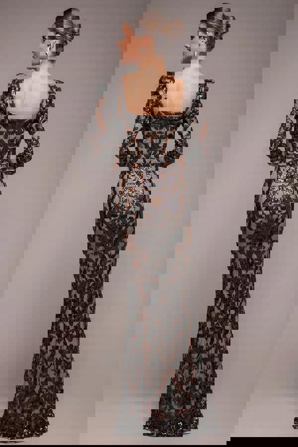 This black dress, with its square neckline, three-quarter sleeves, and exquisite embroidered sequin detailing on the lace, is designed to make you stand out at formal parties, wedding events, and black-tie occasions.