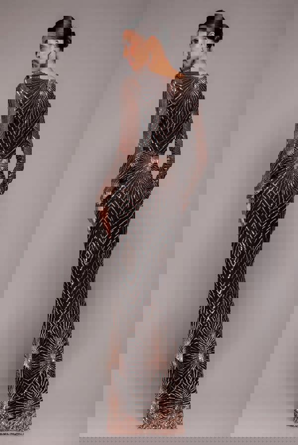 This impressive sparkling evening dress brings a unique twist to a classic little number.
