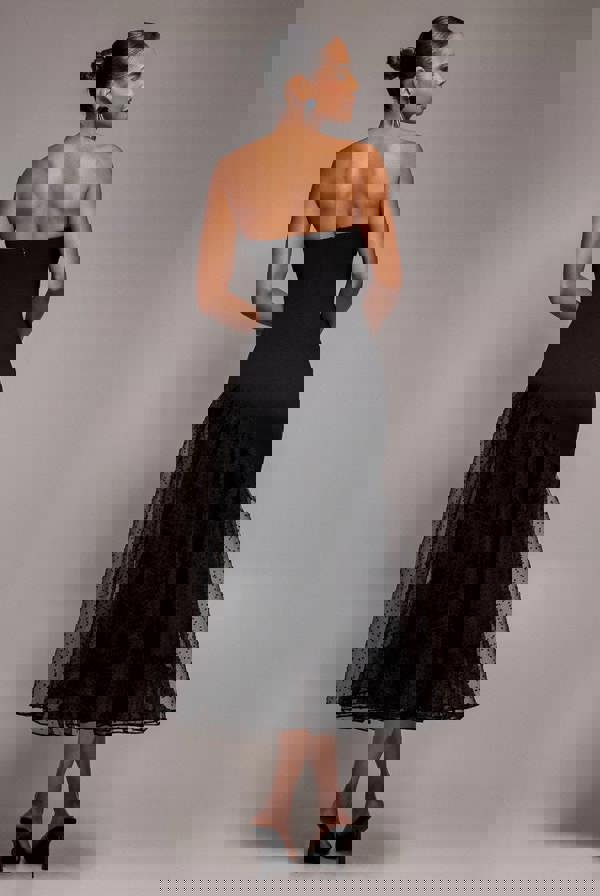 Asymmetric hemline adds modern drama, while the black polka dot organza tiered skirt delivers soft volume and fluid movement with every step.