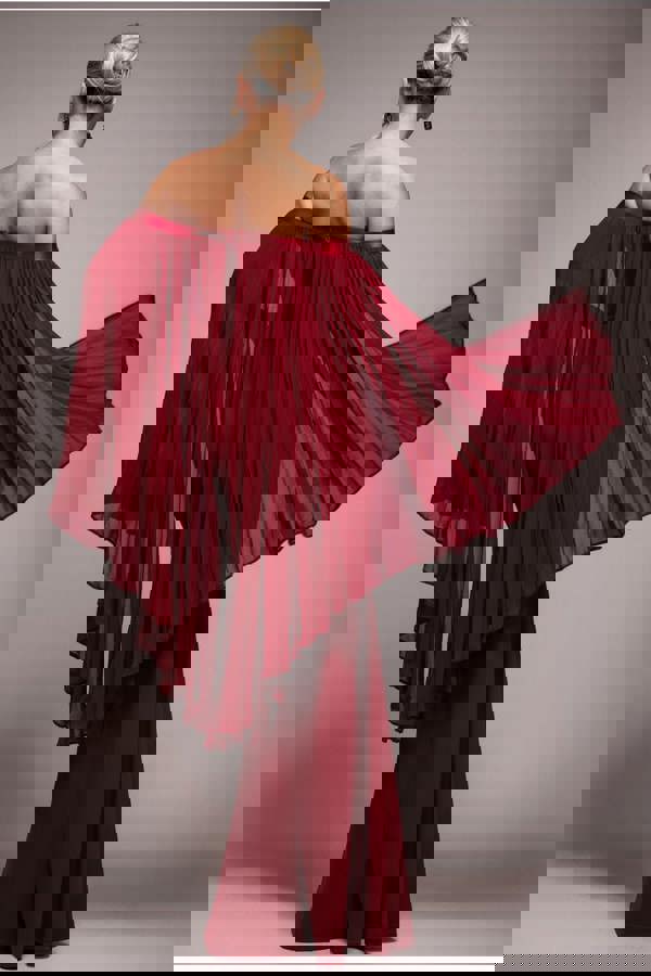 Burgundy red glamour reaches new heights with the Goddiva Strapless Maxi Dress with Pleated Chiffon Cape.