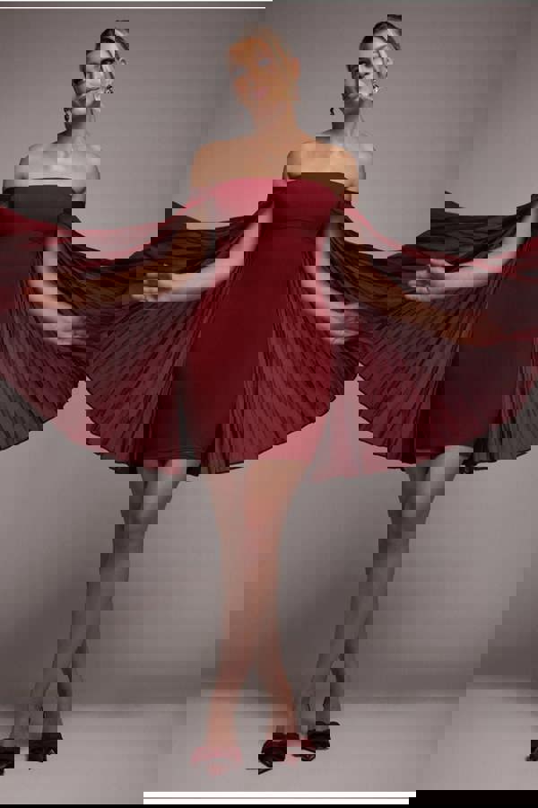 Burgundy luxury meets sultry glamour with the Goddiva Strapless Mini Dress featuring a pleated chiffon off the shoulder cape.