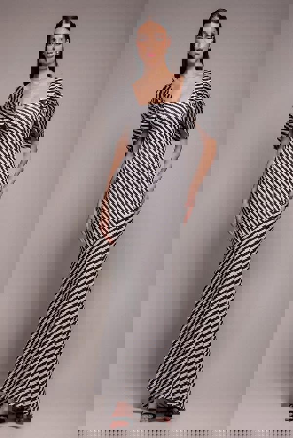 Effortlessly glamorous and ultra feminine, the Goddiva Stripe Off Shoulder Bow Back Satin Bow Maxi Dress in Black White is perfect for nights out, cocktail parties, and special occasions.