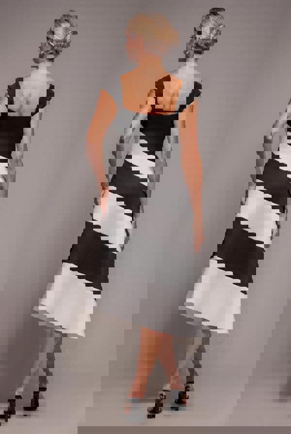 Bold black and cream stripes sculpt the figure beautifully, giving this chic midi length silhouette an expensive edge with an affordable price tag.