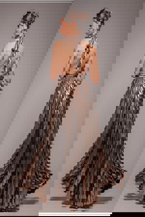 Gleaming in a stunning shade of bronze, the Goddiva Sunrise Foil Halter Neck A-Line Maxi Dress is a perfect blend of glamour and elegance.