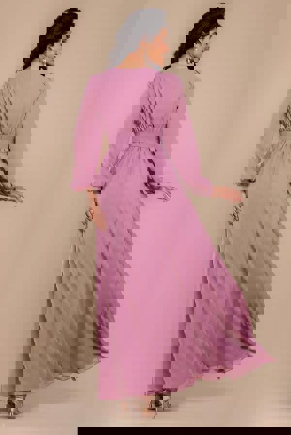 The Goddiva Sustainable Front Split Wrap Style Chiffon Maxi Dress delivers high-impact style with a conscious twist.