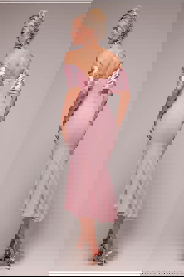 Sculpt your silhouette in the Goddiva Twist Knot Satin & Scuba Bardot High Low Midi Dress in Blush Pink.